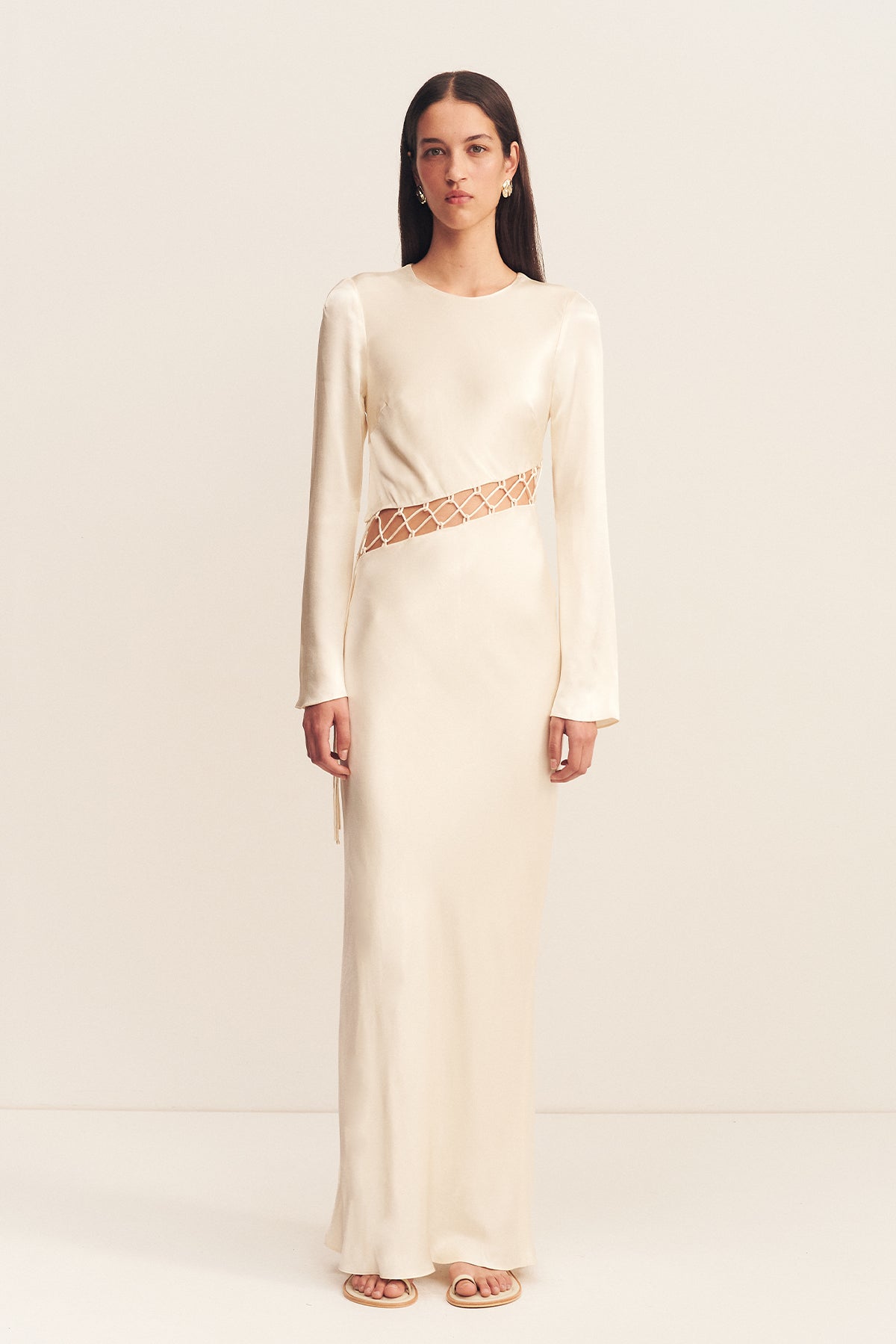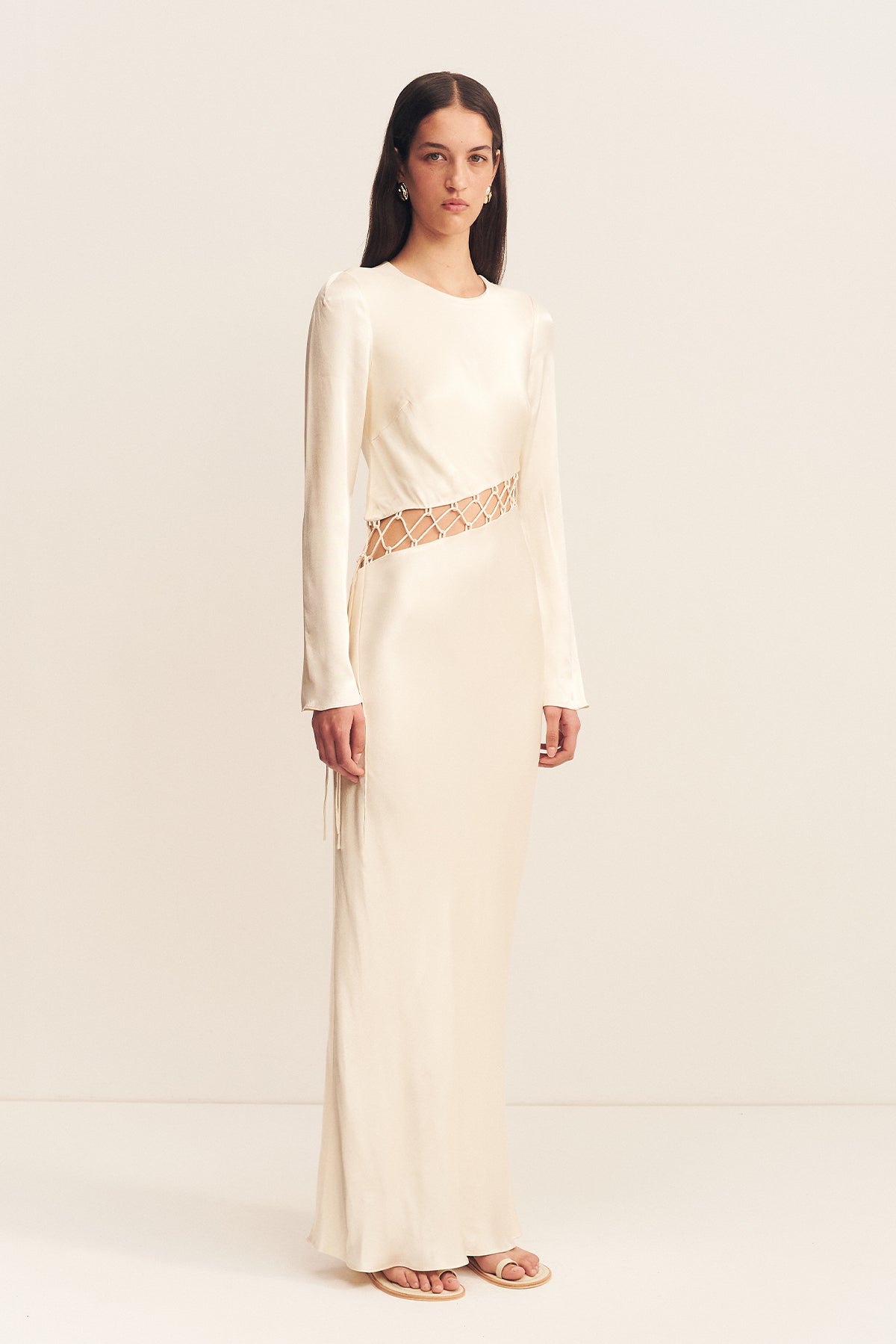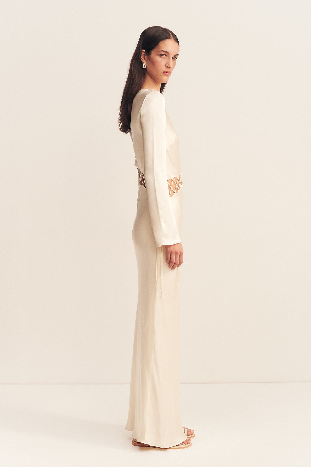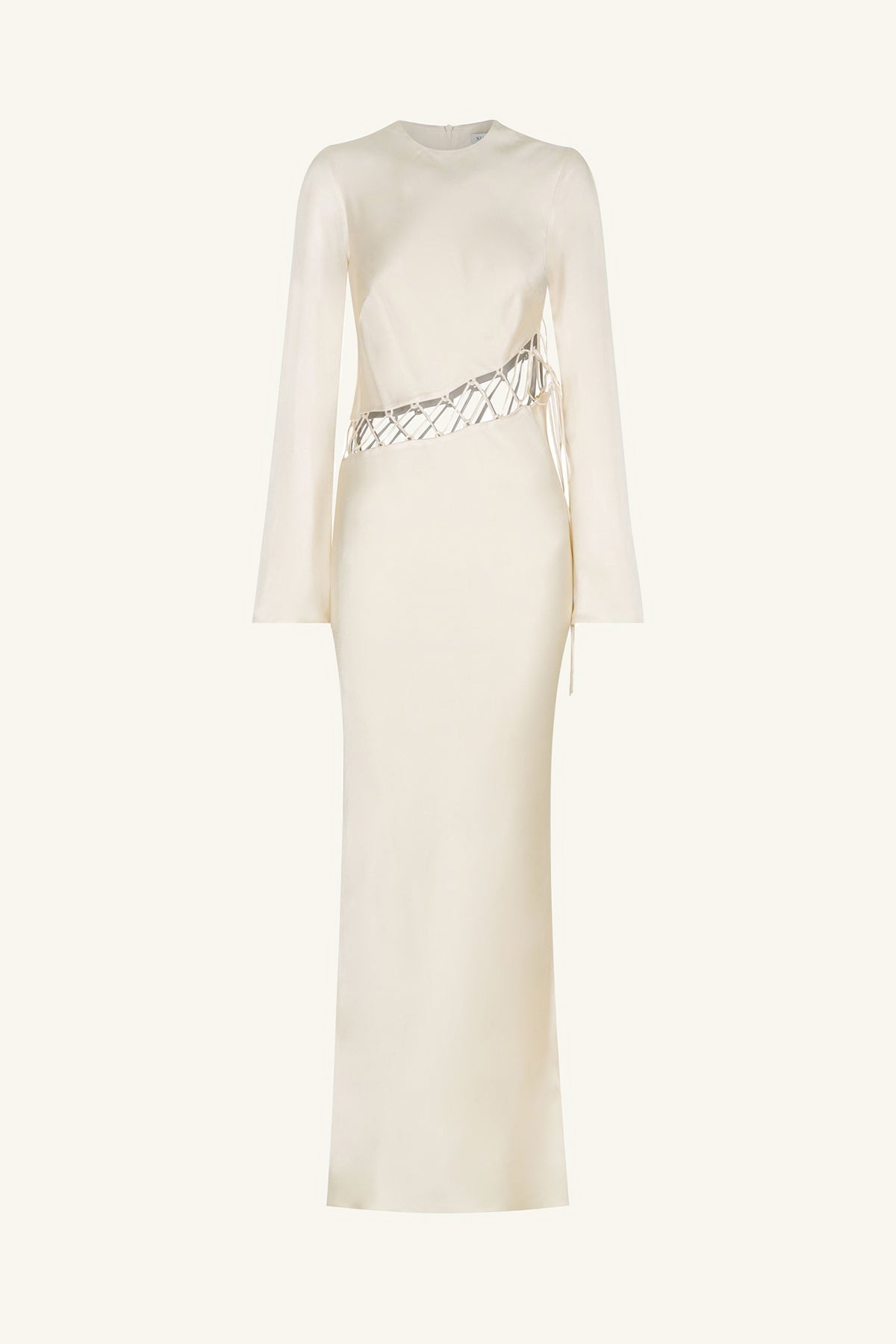 Long sleeve maxi dress with asymmetrical lace up detail in a LENZING? ECOVERO? with luxurious satin finish.
