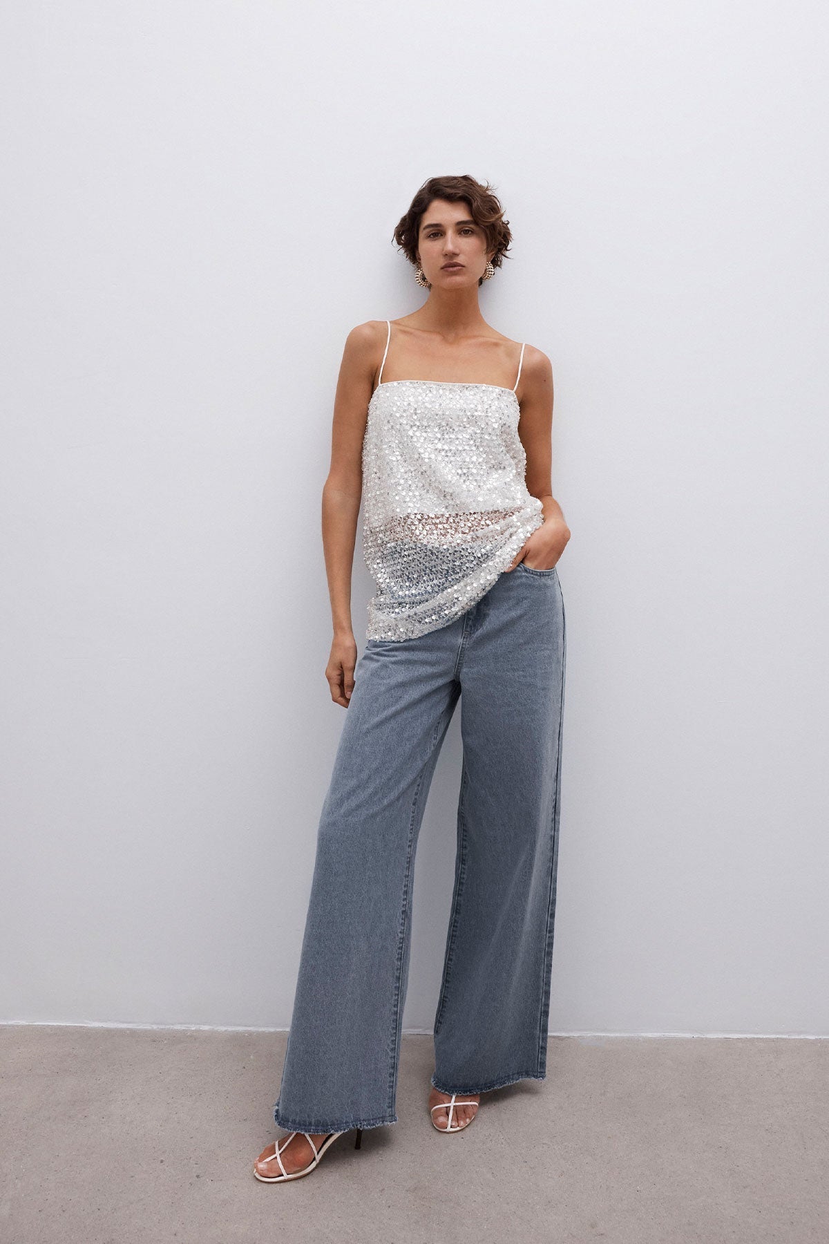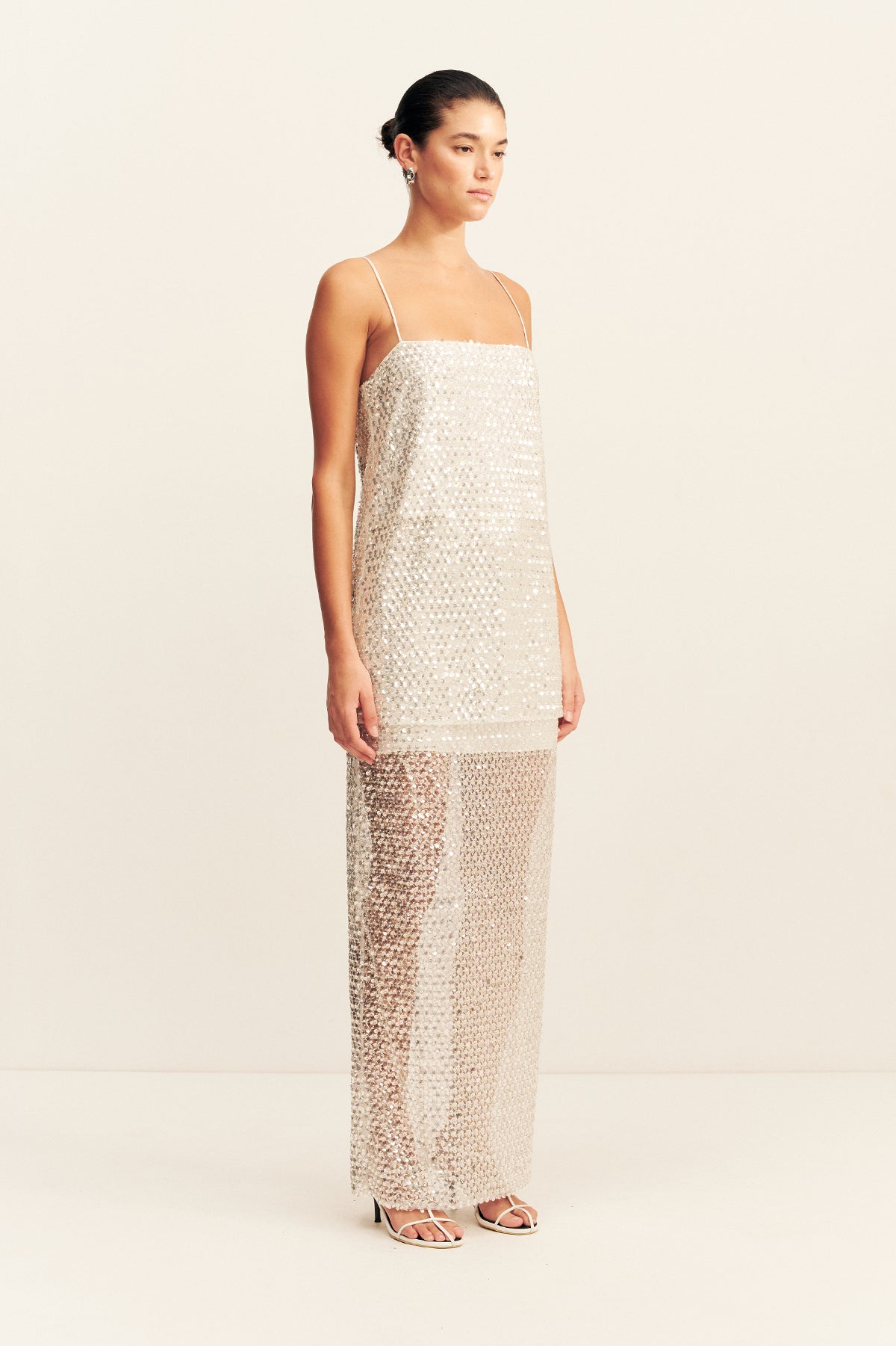 Longline cami in an embellished mesh.