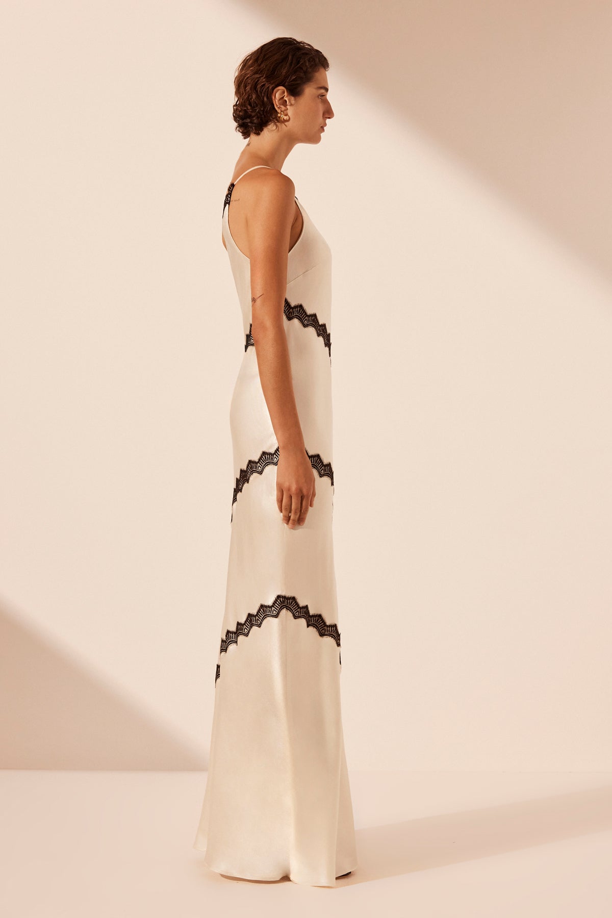 Asymmetrical maxi dress with lace detail in cream in a LENZING ECOVERO with luxurious satin finish.