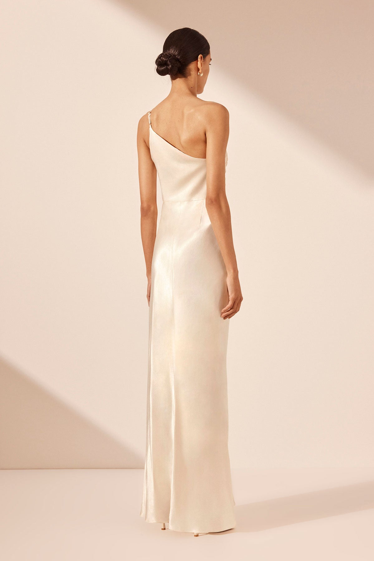 Ruched asymmetrical maxi dress in cream in a LENZING? ECOVERO? with luxurious satin finish.