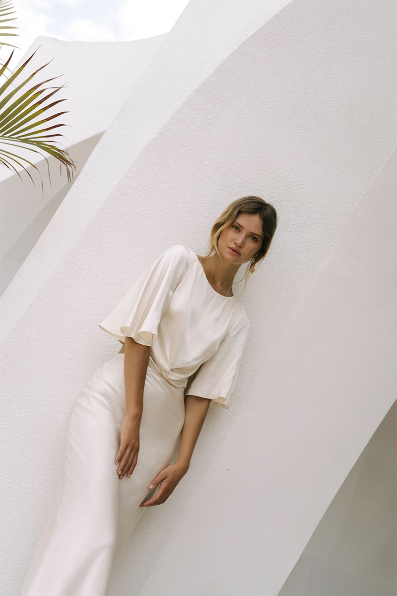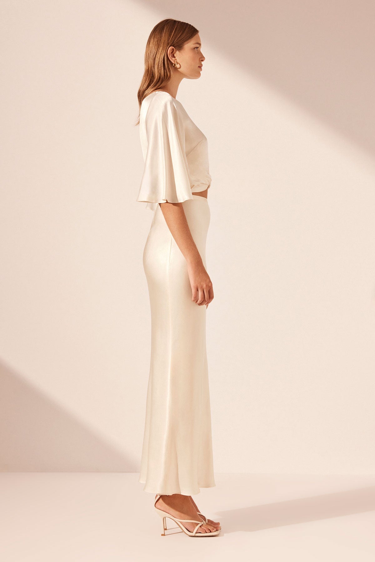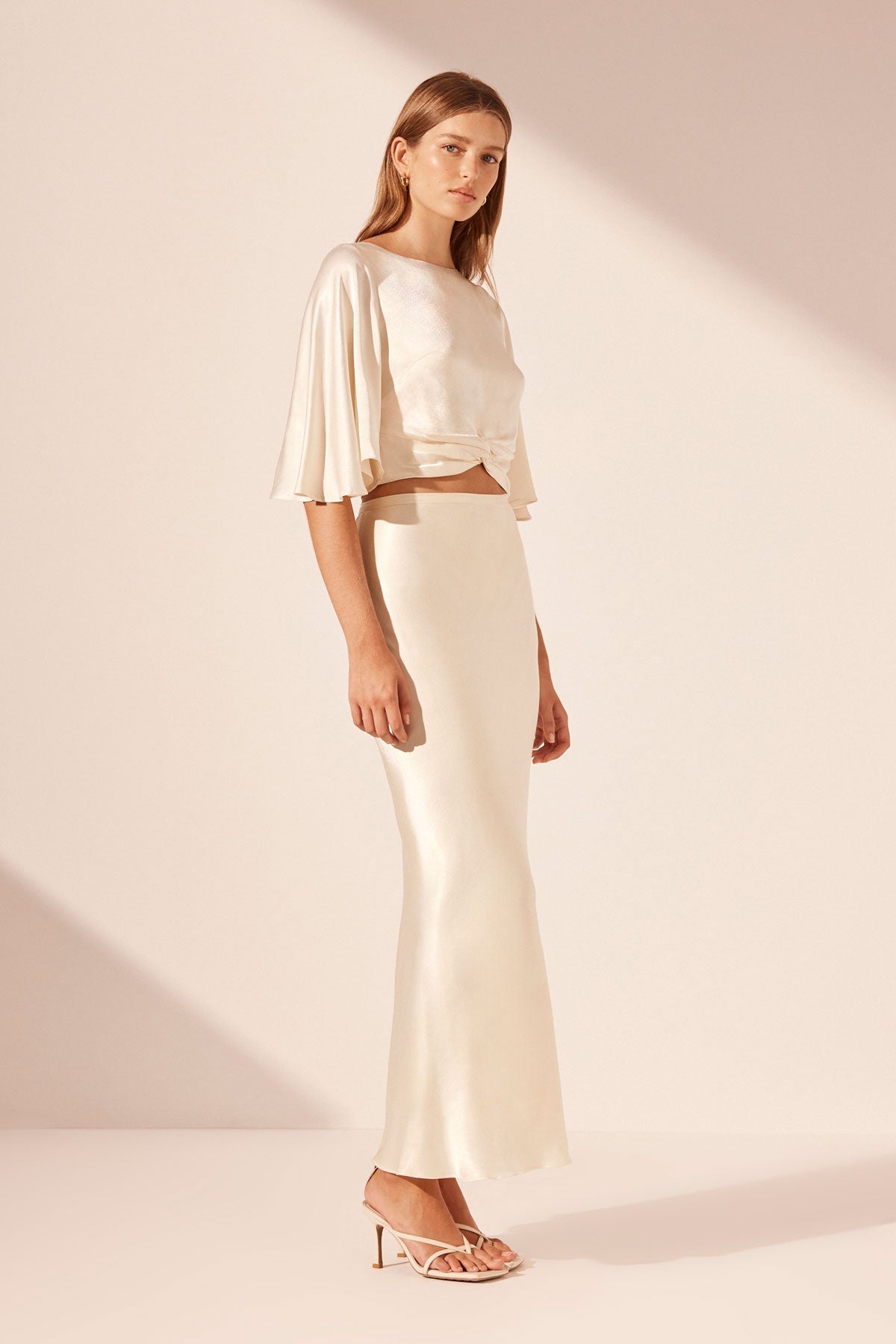 Bias maxi skirt in cream in a silk touch fabric with a luxurious sheen.
