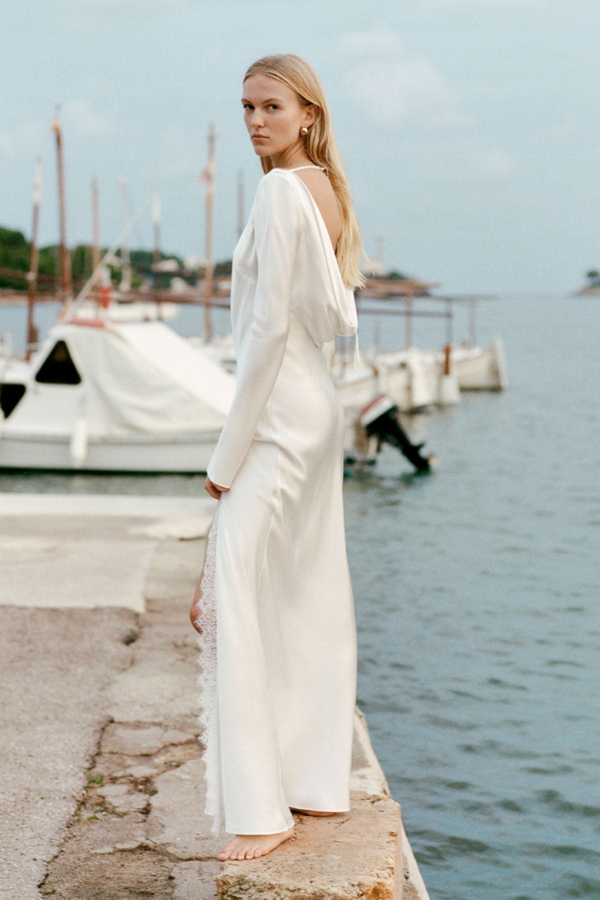 An elevated approach to minimalism for the modern bride. Discover a classic boat neckline, bias cut maxi silhouette, and cowl back pulled together with a delicate tie. Spun from 100% luxury silk with tapered lace detailing, consider this a forever gown that will be cherished beyond the big day.