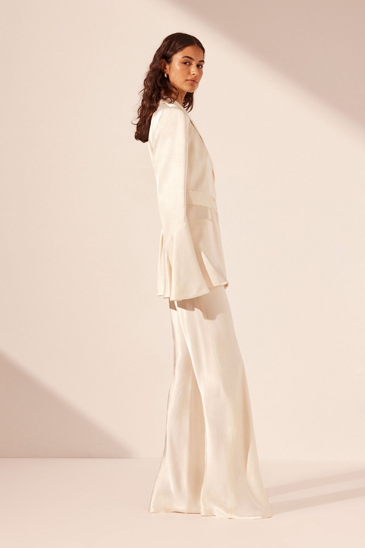 Flared sleeve belted blazer in a cream in a LENZING? ECOVERO with a luxurious satin finish.