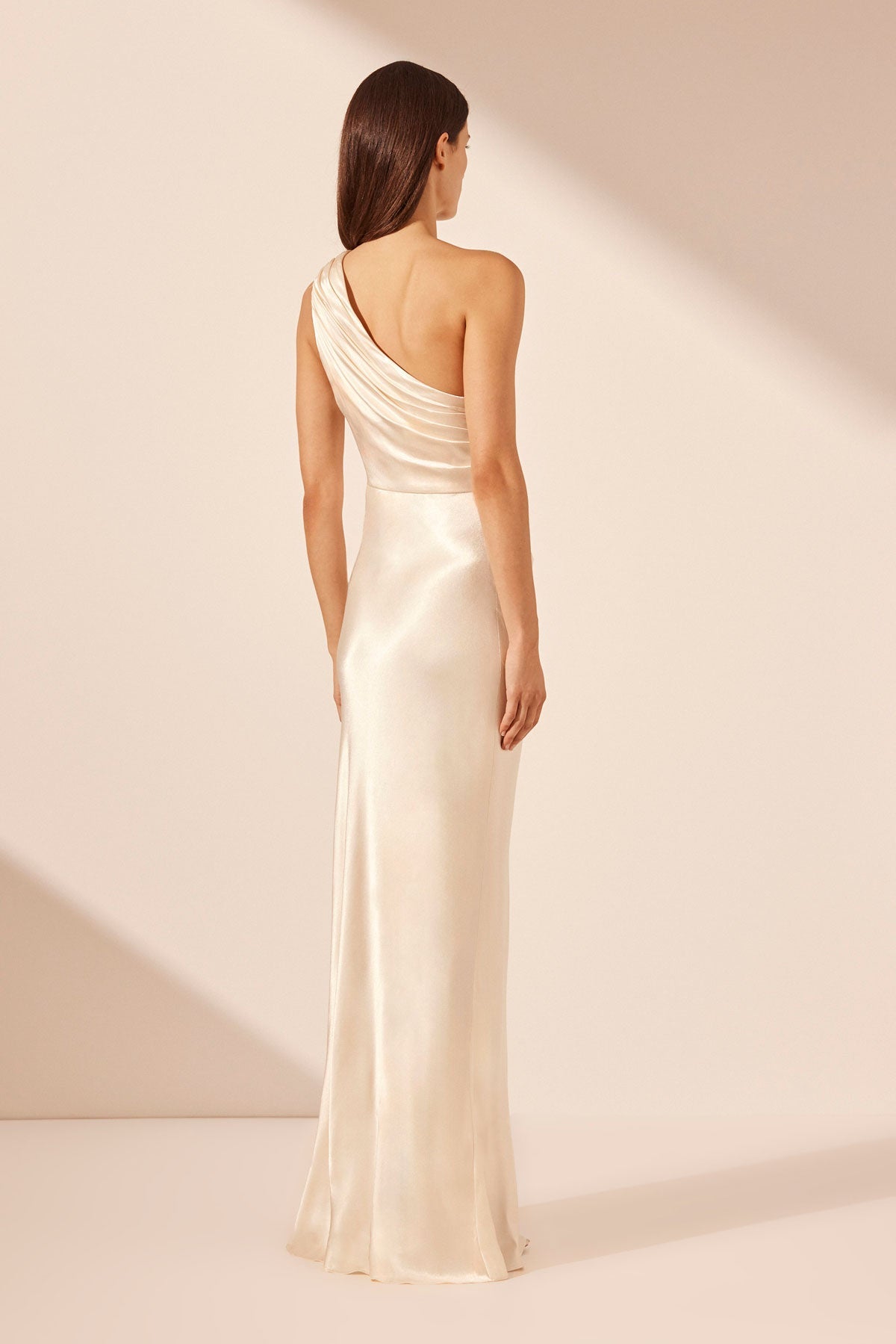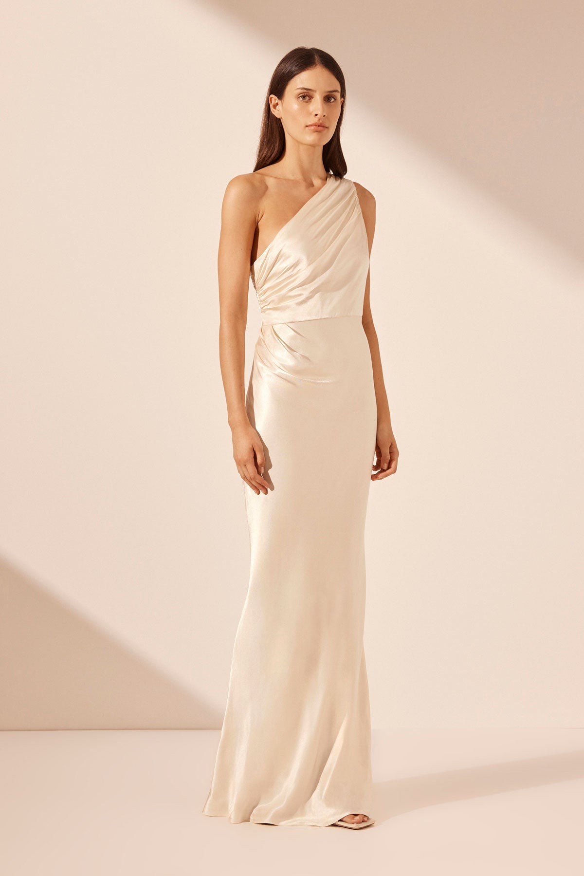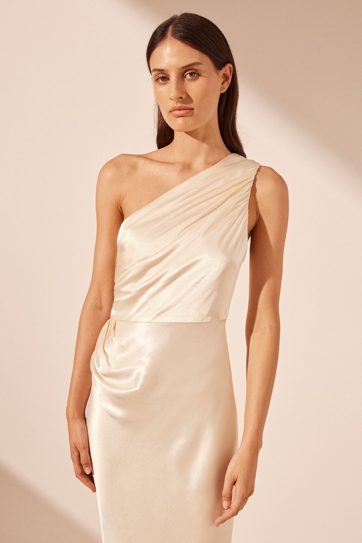 Asymmetric maxi dress with ruching in cream in a LENZING? ECOVERO? with luxurious satin finish.