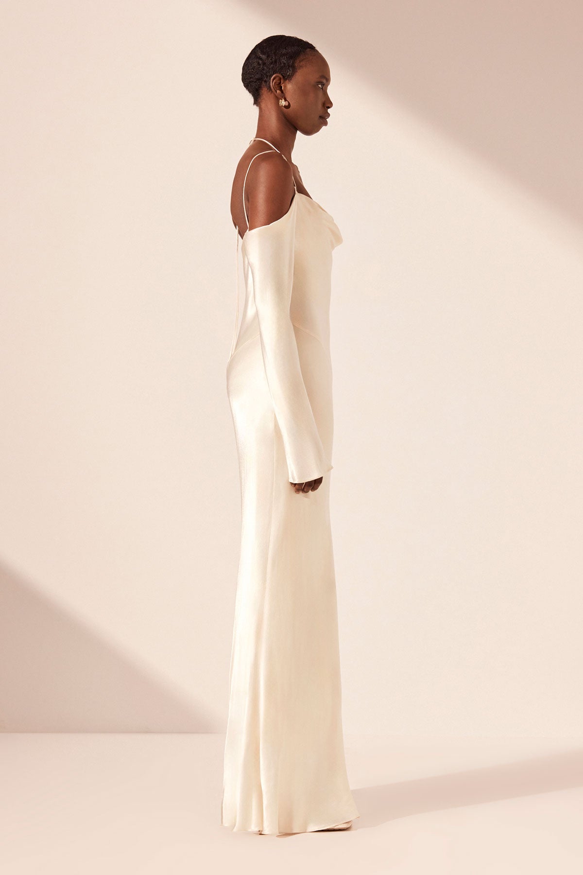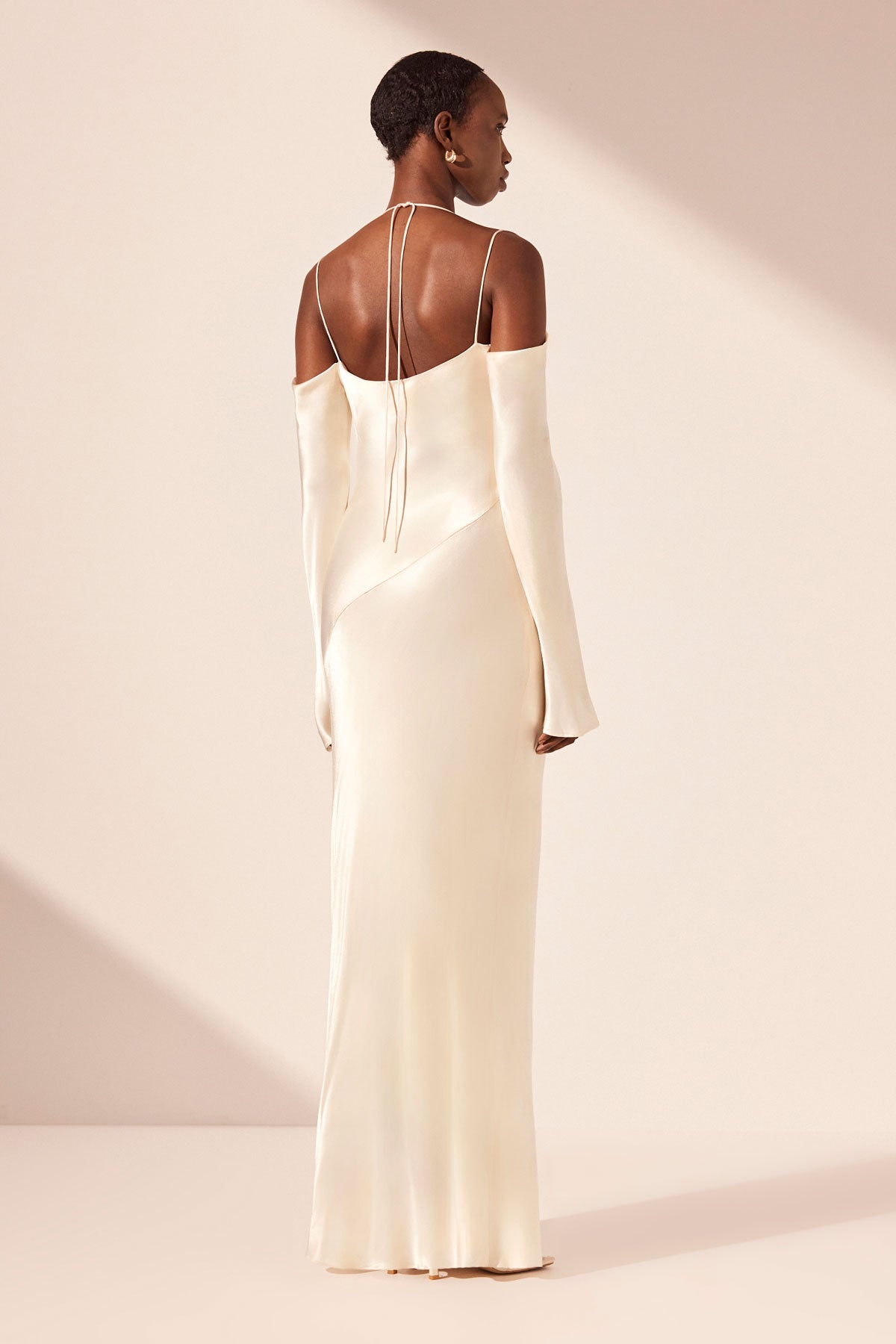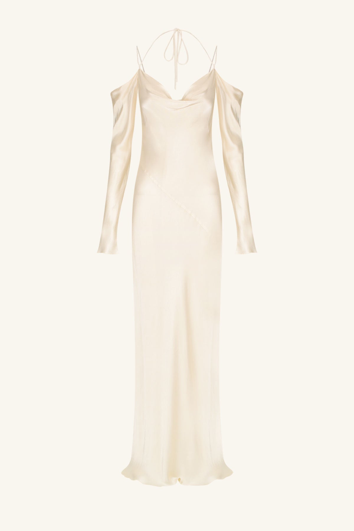 Off shoulder maxi dress with tie details in cream in a LENZING ECOVERO with a luxurious satin finish.