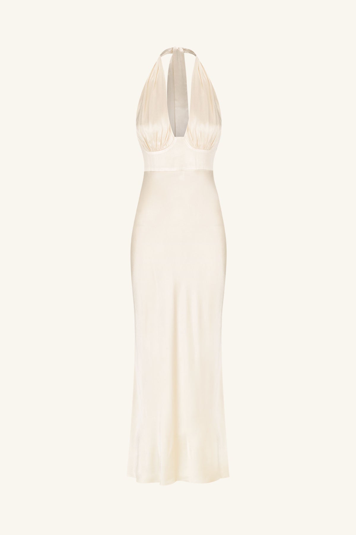 LA LUNE PLUNGED HALTER MIDI DRESS - CREAM