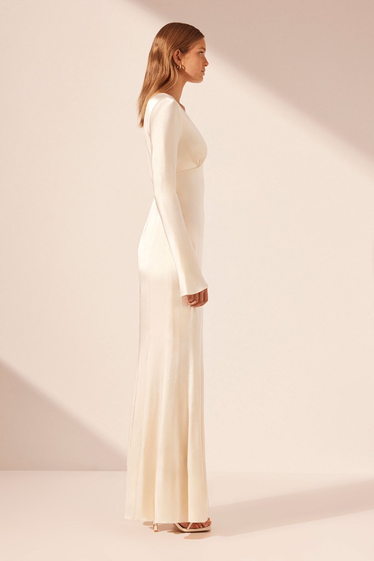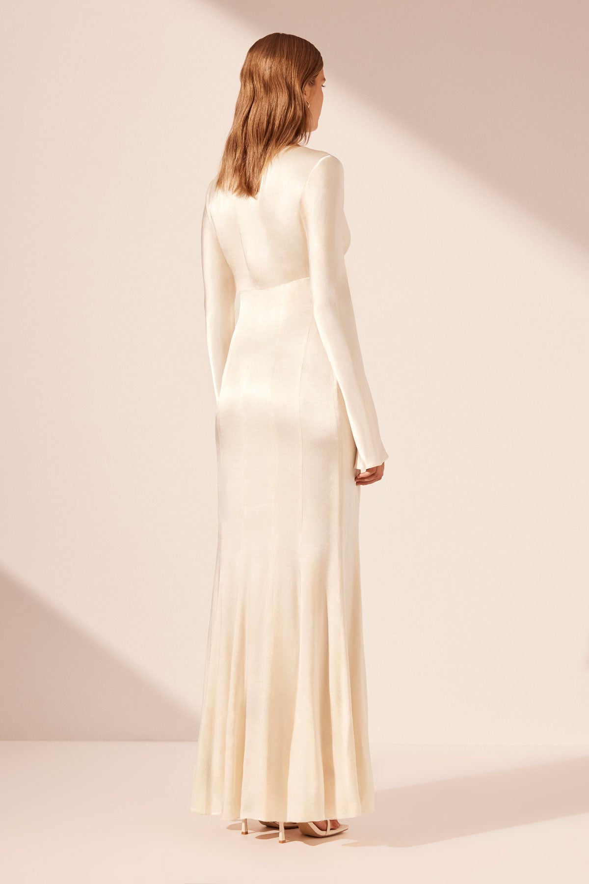 Plunged panelled maxi dress with flared sleeves in cream in a LENZING ECOVERO with a luxurious satin finish.