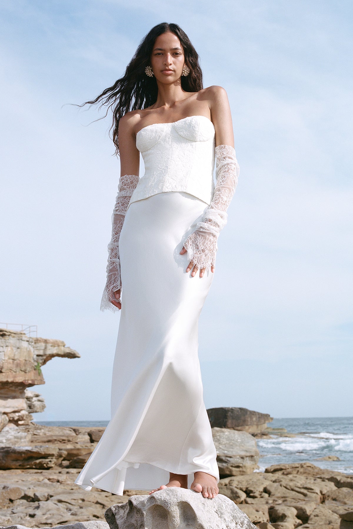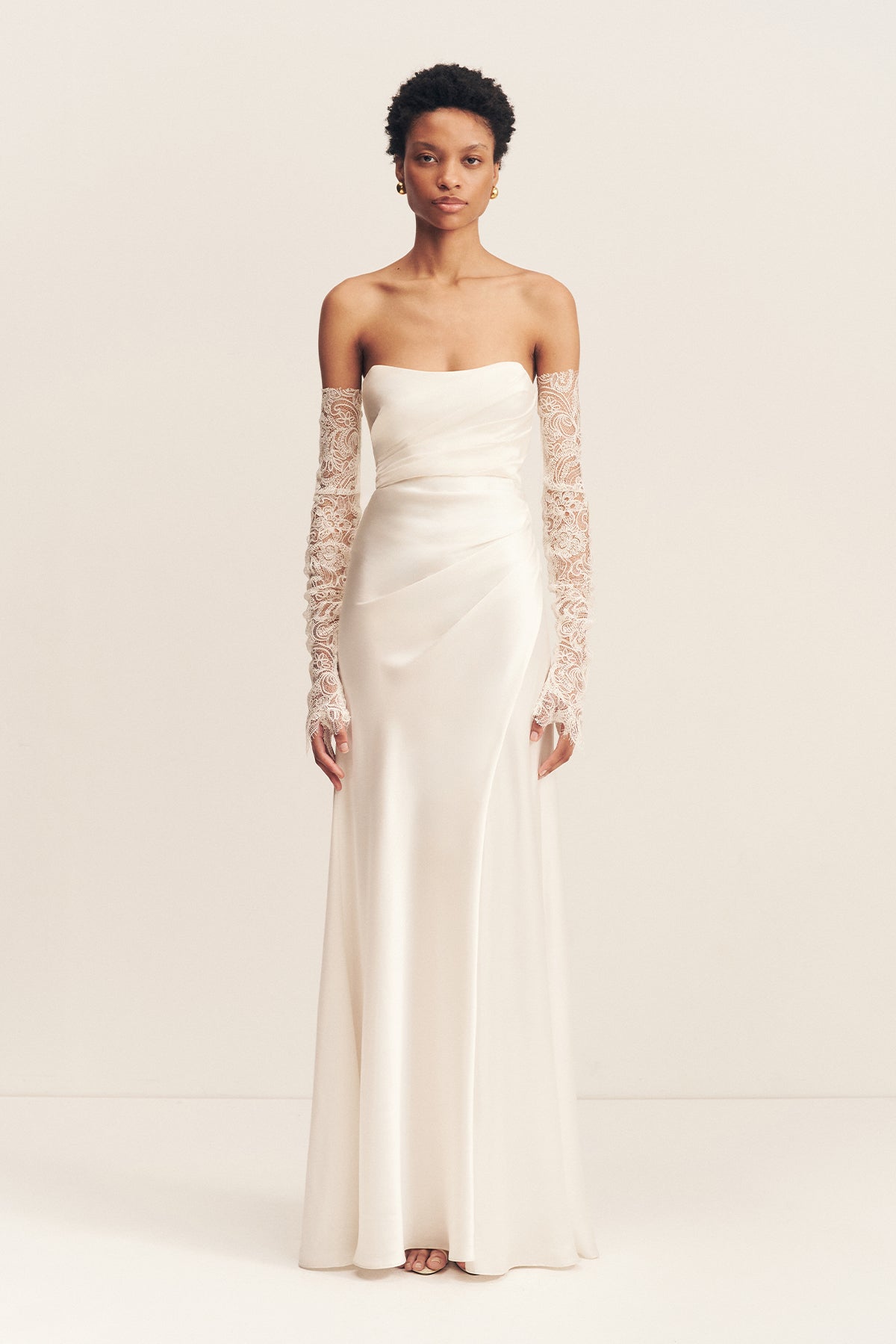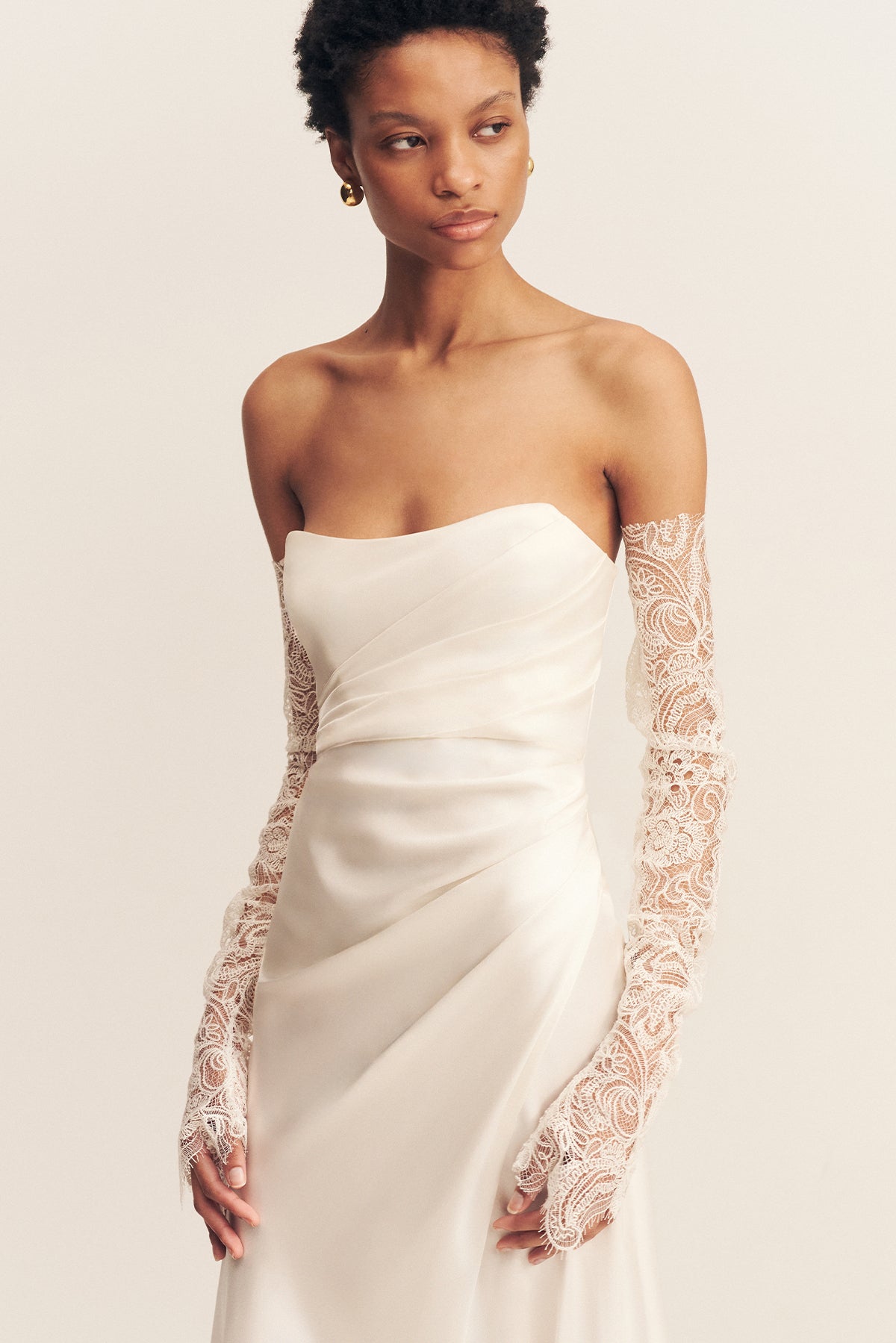 An elegant glove featuring delicate sheer lace with a scalloped edge for a timeless finish.