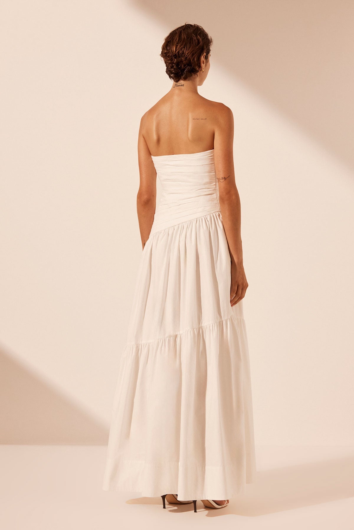 Strapless tiered maxi dress in ivory in an organic cotton poplin.