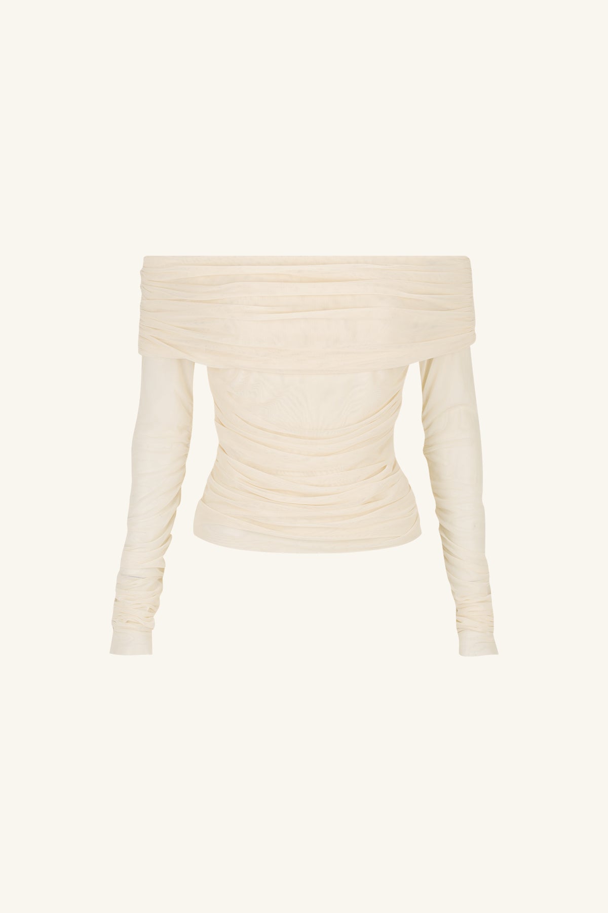 Long sleeve off shoulder top in ivory in a sheer mesh.