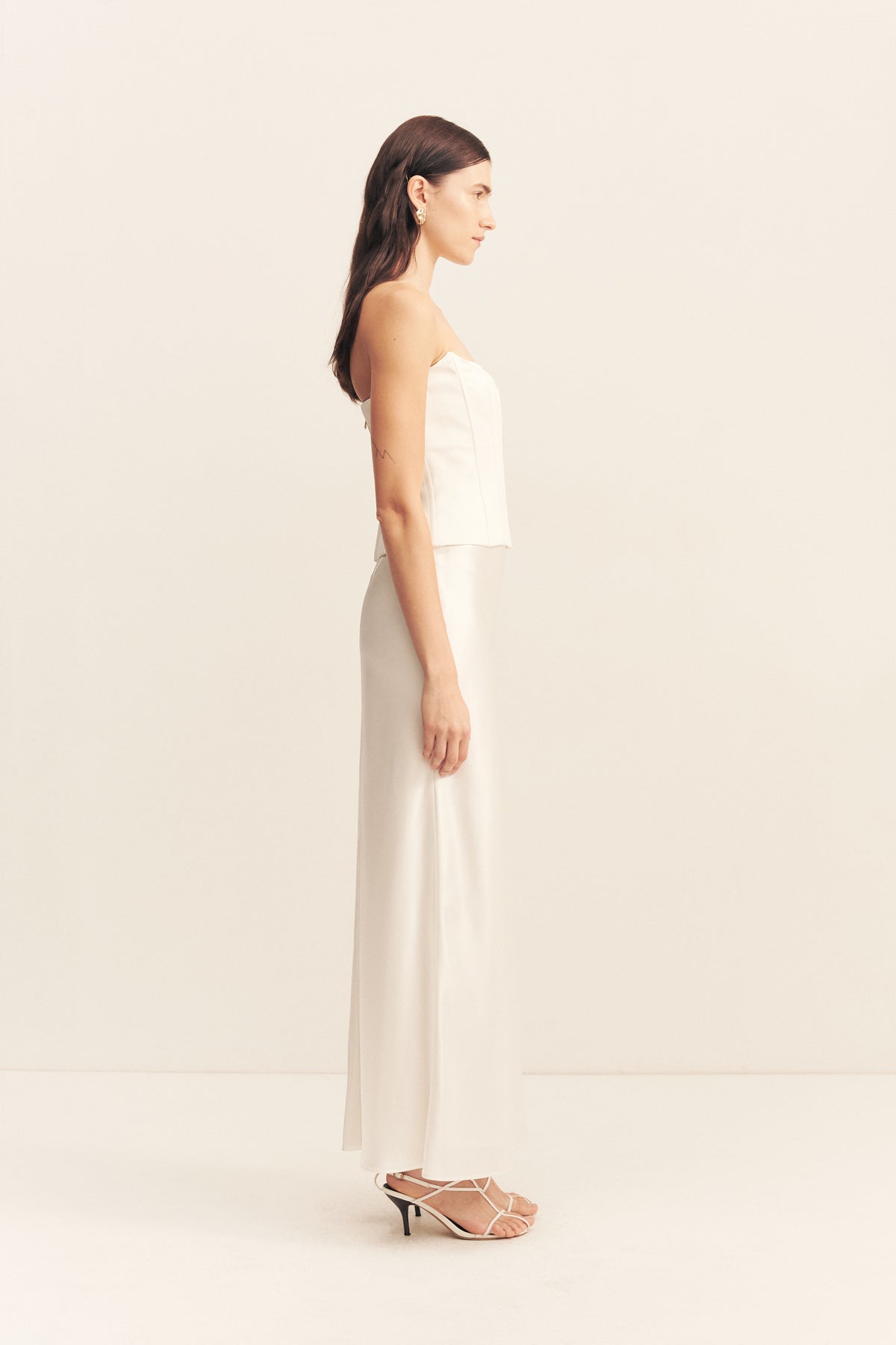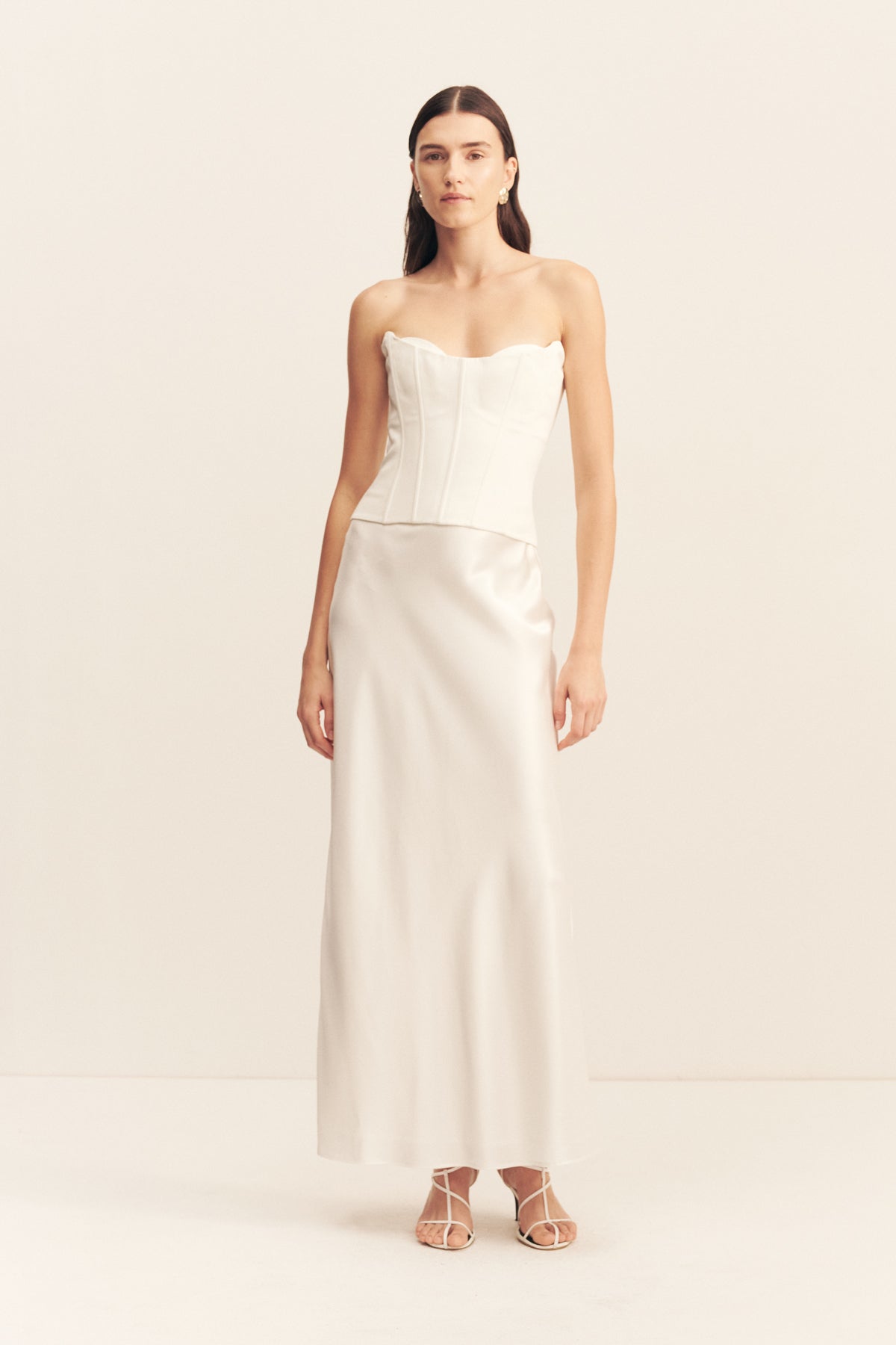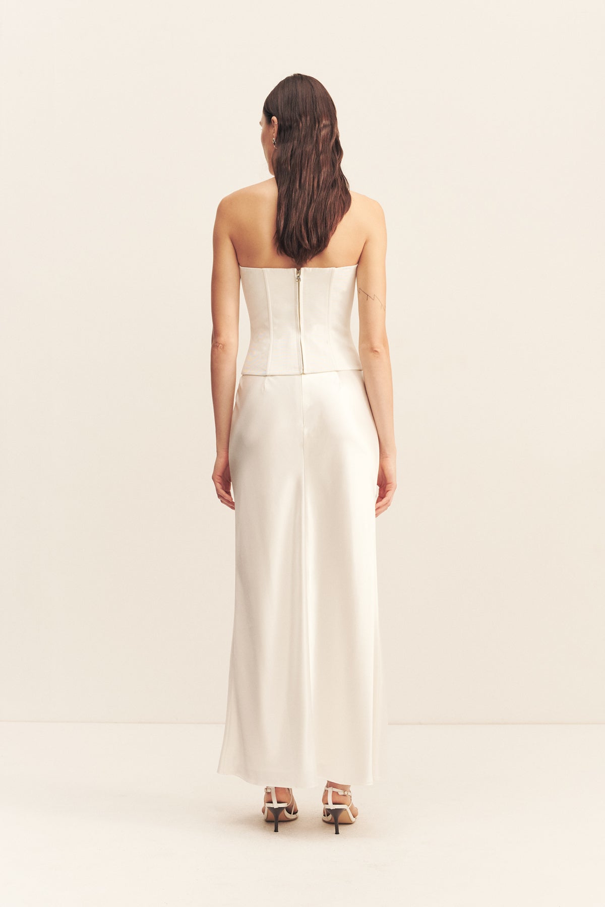 Strapless panelled corset in ivory in a textured ottoman viscose.