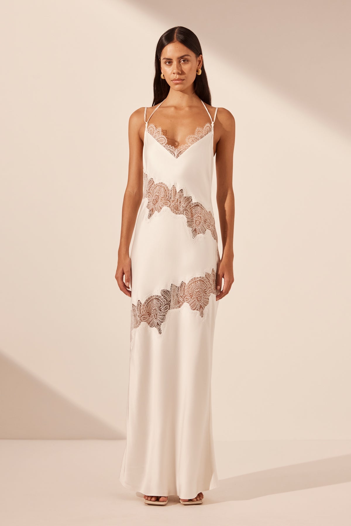 Plunged maxi dress with lace panel details in ivory in a LENZING ? ECOVERO ? Viscose with a luxurious matte finish.